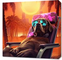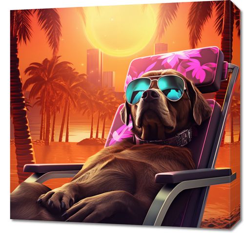 Obraz z serii pop art zatytułowany Lato w Stylu. Na tej zabawnej ilustracji widzimy psa rasy labrador, wygodnie ułożonego na leżaku plażowym, w okularach przeciwsłonecznych, z tłem zachodzącego słońca i palm. Jego relaksująca poza i luźny styl, w połączeniu z żywymi kolorami tropikalnego wschodu lub zachodu słońca, oddają atmosferę beztroskich wakacji. Obraz ten jest idealnym wyborem dla miłośników psów i letnich klimatów, świetnie nadaje się do dekoracji ścian w domach, hotelach nad morzem, czy jako dodatek do letnich barów i restauracji, wprowadzając element humoru i wakacyjnego luzu.