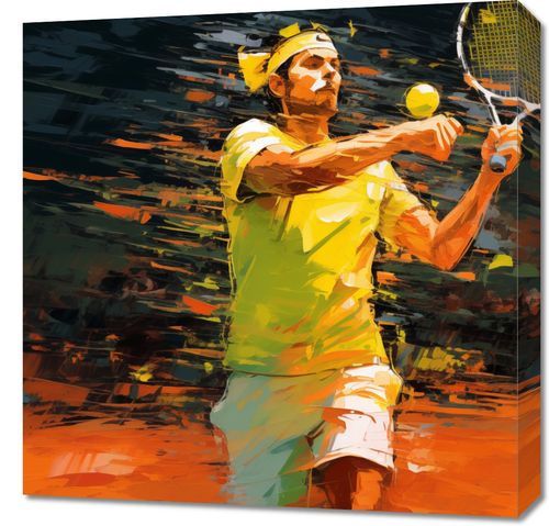 Obraz z serii abstrakcja zatytułowany Mistrzowski Serwis. Na tym żywiołowym dziele sztuki widzimy sylwetkę tenisisty w pełnym ruchu, wykonującego potężny serwis. Stylizacja obrazu przypomina impresjonistyczne pociągnięcia pędzla z żywymi plamami farby, które tworzą dynamiczny, prawie abstrakcyjny obraz akcji na korcie tenisowym. Barwy, od ciepłych żółci i pomarańczy do intensywnych cieni, podkreślają energię i pasję sportowej rywalizacji. To dzieło sztuki oddaje siłę, skupienie i elegancję tenisowej gry, będąc idealnym akcentem dla przestrzeni sportowych oraz dla miłośników i entuzjastów tenisa.