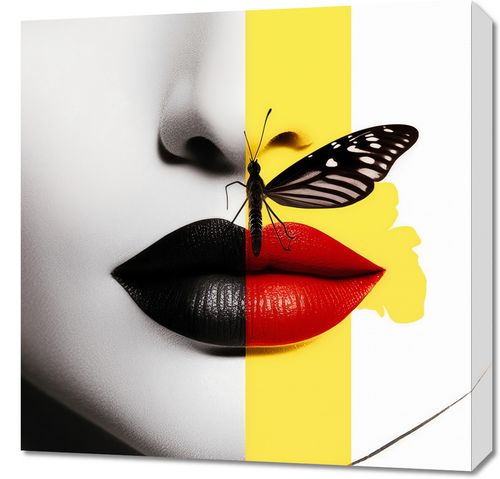 Obraz z serii abstrakcja zatytułowany Motyla Piękność. Ten obraz przedstawia twarz kobiety podzieloną na dwa kontrastujące segmenty: jeden w czerni i bieli, drugi w żywych kolorach z motylem na ustach. Ilustracja eksploruje temat dualizmu natury ludzkiej, piękna i jego zmienności. Obraz ten jest idealnym wyborem dla przestrzeni o współczesnym designie, takich jak salony piękności, studia artystyczne, a także jako wyrazisty element dekoracyjny w nowoczesnych domach.
