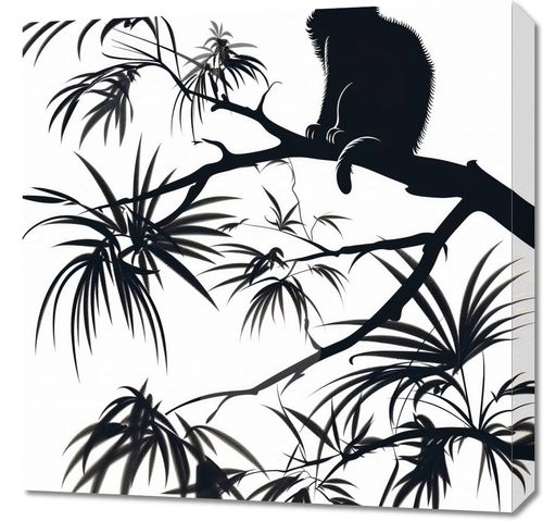 Obraz z serii wnętrza zatytułowany Na Gałęzi przedstawia sylwetkę kota siedzącego na gałęzi, zarysowaną na tle jasnego, jednolitego tła. Całość kompozycji utrzymana jest w stylu sumi-e, nawiązującym do tradycyjnej wschodniej techniki tuszem. Kontury kota i roślin są wyraziste, z delikatnymi szczegółami, które przywodzą na myśl efekt cieniowania i głębi. W tle roślinność, prawdopodobnie bambus lub tropikalne palmy, jest przedstawiona w sposób stonowany, co wskazuje na użycie gradientu cieni. Grafika ta oddaje spokój i harmonię, charakterystyczne dla azjatyckiej estetyki i sztuki. Idealnie nadawałaby się jako dekoracja w przestrzeniach inspirowanych minimalizmem i naturą.
