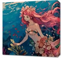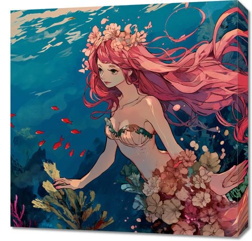 Obraz z serii wnętrza zatytułowany Nimfa Oceanu przedstawia eteryczną postać kobiecą zatopioną w głębinach morskich. Jej długie, różowe włosy płyną z prądem wody, mieszając się z otaczającymi ją kwiatami i roślinami morskimi. Czerwone ryby dodają akcentu kolorystycznego, tworząc wrażenie ruchu i życia pod wodą. Postać nimfy, z jej delikatną sylwetką i spokojnym wyrazem twarzy, stanowi centralny punkt kompozycji, sugerując spójność człowieka z naturą. Ten oniryczny obraz świetnie sprawdzi się jako element dekoracyjny w przestrzeniach relaksacyjnych takich jak spa, salony piękności, a także jako inspirująca dekoracja do pokoju osobistego lub medytacyjnego, zachęcając do refleksji i wyciszenia.