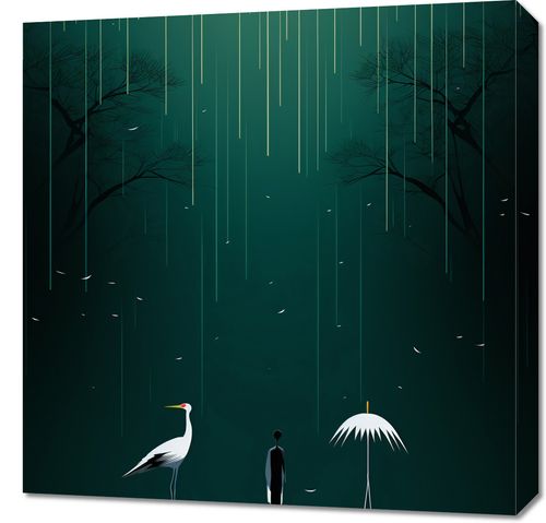 Obraz z serii wnętrza zatytułowany Nocne Marzenia. Scena przedstawia tajemniczą postać mężczyzny stojącego obok białej czapli, obaj są zanurzeni w wodzie i skierowani ku jasnoświecącemu księżycowi. Delikatne krople deszczu spadają z nieba, tworząc subtelną melodię natury, podczas gdy zarysy drzew rzucają cienie na monochromatyczne tło. Biały parasol unoszący się nad wodą dodaje elementu nieoczekiwanej magii i tajemniczości. Ta głęboka i metaforyczna kompozycja idealnie pasuje do nowoczesnych galerii sztuki, medytacyjnych przestrzeni oraz salonów czytania, gdzie cisza i kontemplacja dominują nad zgiełkiem codzienności.