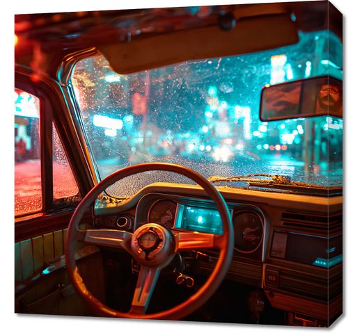 Obraz z serii pop art zatytułowany Nocny Kierowca, przedstawia widok z wnętrza klasycznego samochodu, patrząc przez deszczową, skraplaną szybę na rozświetlone neony miejskiego pejzażu nocą. Ciepłe, czerwone oświetlenie wnętrza samochodu kontrastuje z hipnotyzującym błękitem i elektrycznymi odcieniami świateł zewnętrznych, tworząc intymną, a jednocześnie dynamiczną atmosferę. Kropelki deszczu na szybie dodają tekstury i głębi, sprawiając, że scena jest zarówno realistyczna, jak i liryczna. To dzieło sztuki mogłoby znaleźć swoje miejsce w przestrzeniach nowoczesnych, miejskich loftów lub jako akcent w barze o tematyce retro, wprowadzając element tajemniczości i miejskiego romansu.