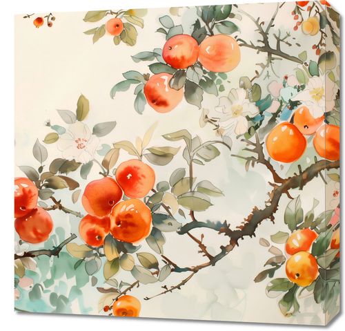 Obraz z serii abstrakcja zatytułowany Persymony. Przedstawia delikatną i kolorową ilustrację gałęzi owocowych w stylu azjatyckiej akwareli. Na obrazie widzimy rozkwitające kwiaty oraz dojrzałe, soczyste owoce persymony których intensywna pomarańczowa barwa jest pięknie wyeksponowana na tle pastelowych kolorów. Liście i gałęzie są przedstawione z subtelnymi niuansami zieleni i brązów, co dodaje głębi i naturalnego charakteru scenie. Ta sztuka łączy w sobie tradycyjne motywy i techniki malarskie z nowoczesnym podejściem do koloru i kompozycji, co czyni ją zarówno klasyczną, jak i współczesną. Obraz ten idealnie nadawałby się do przestrzeni, które cenią spokój i harmonię, takich jak salony relaksacyjne, gabinety spa, czy jako wyrafinowany akcent w domowej jadalni.