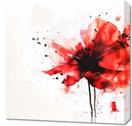 Obraz z serii abstrakcja zatytułowany Płynna Akwarela. Na obrazie przedstawiony jest kwiat w stylu akwarelowym, z dominującą czerwoną paletą barw, która przechodzi w mocne akcenty czerni w centrum kwiatu. Obraz ma dynamiczny i spontaniczny charakter, co podkreślają rozbryzgi i krople farby rozchodzące się wokół kwiatu. Przypomina to efekt plamy, który dodaje kompozycji artystycznego wyrazu i energii. Kontrast między delikatnymi czerwieniami a głęboką czerń centrum kwiatu przyciąga wzrok i czyni obraz bardzo wyrazistym. Tło jest jasne z subtelnie zaznaczonymi plamami, co dodatkowo akcentuje dramatyzm i piękno przedstawionego kwiatu.