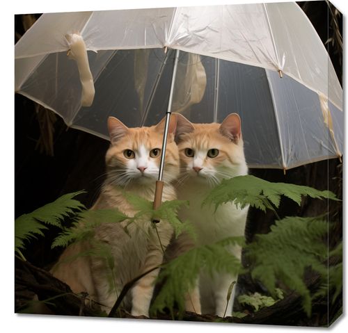 Obraz z serii wnętrza zatytułowany Podwójna Ochrona przedstawia dwie urocze, rude koty szukające schronienia pod przezroczystym parasolem, który zdaje się być koroną zielonej paproci. Ich symetryczne odbicie w połyskliwej strukturze parasola dodaje głębi i charakteru kompozycji. Ciepłe odcienie futra kotów kontrastują z ciemnym, zielonym tłem, co sprawia, że stają się centralnym punktem obrazu. Ich spojrzenia są skierowane prosto w obiektyw, co nadaje fotografii osobisty i intymny charakter. To zdjęcie idealnie uchwyciło moment spokoju i ochrony w naturalnym otoczeniu, a zarazem subtelnie podkreśla więź między dwoma zwierzętami. Idealne do wnętrz o domowym, ciepłym charakterze, zarówno dla miłośników kotów, jak i miłośników przyrody.