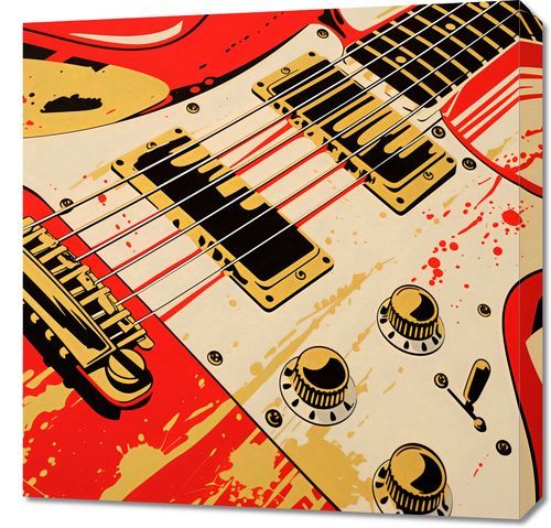 Obraz z serii abstrakcja zatytułowany Przed Graniem. Przedstawia zbliżenie na czerwoną gitarę elektryczną, której design jest wyrazisty i pełen energii. Widać detale instrumentu, takie jak przetworniki, potencjometry i struny, które są wyraźnie zaznaczone kontrastującymi kolorami złota, czerni i bieli na tle intensywnej czerwieni. Rozpryski i plamy farby na korpusie gitary nadają plakatowi surowy, rockowy charakter, co może sugerować żywiołowość i pasję muzyki granej na tym instrumencie. Ten obraz mógłby być atrakcyjnym elementem dekoracyjnym w przestrzeniach dedykowanych muzyce, takich jak sale prób, studia nagraniowe, pokoje młodzieżowe lub jako odważny akcent w nowoczesnym salonie.