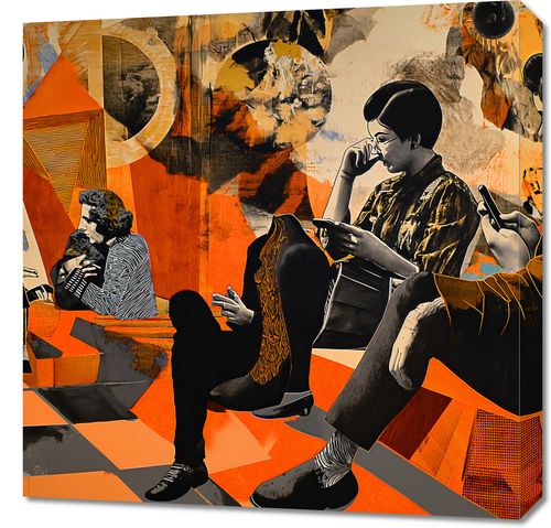 Obraz z serii pop art zatytułowany Przestrzeń Do Dialogu. Prezentuje grupę ludzi w stylizowanych retro ubraniach, zanurzonych w konwersacji i zatopionych w swoich myślach, co sugeruje głębię ludzkiego połączenia i introspekcji. Tło plakatu to geometryczne i abstrakcyjne formy w odcieniach pomarańczu, żółci i brązu, nawiązujące do lat 60. i 70. XX wieku, wprowadzając elementy vintage do nowoczesnej przestrzeni. Postacie wydają się pochłonięte rozmową, a ich pozy i gesty odzwierciedlają osobistą wymianę i komunikację. Obraz ten jest idealny do kawiarni, salonów, bibliotek, lub jako inspirujący akcent w domowych biurach, zachęcając do refleksji i twórczego dialogu.