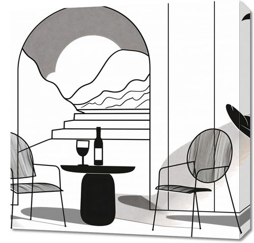 Obraz z serii minimalistyczne zatytułowany Relaks w Monochromie. Obraz przedstawia stylizowaną, monochromatyczną scenerię wnętrza wypoczynkowego, w którym dominuje spokój i prostota. Czarno-białe rośliny dodają życia eleganckiemu, geometrycznemu przestrzeni, a finezyjnie zaprojektowane meble tworzą atmosferę luksusu i komfortu. Na pierwszym planie widoczny jest okrągły stolik z butelką wina i dwoma kieliszkami, sugerujący chwilę relaksu lub intymnego spotkania. Tło stanowi wielki, abstrakcyjny obraz, który może przypominać ułożone w rzędy fale morskie lub schody prowadzące ku nieznanemu. Obraz ten jest doskonały do nowoczesnych mieszkań i miejsc użyteczności publicznej, gdzie dominuje współczesny design i minimalistyczne podejście do dekoracji. Jego prostota i elegancja doskonale odnajdą się w przestronnych salonach, stylowych lobby hotelowych lub modnych przestrzeniach lounge.