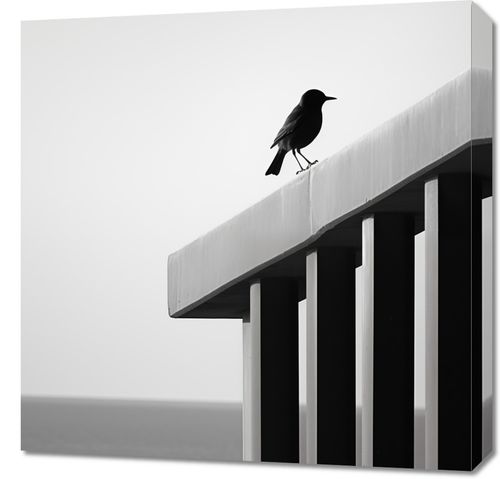Obraz z serii pejzaże zatytułowany Samotna Odchłań. Ten skrajnie minimalistyczny obraz przedstawia pojedynczego ptaka spoczywającego na czystej, białej krawędzi konstrukcji, z subtelnym tłem nieskończonego morza. Zdjęcie w skali szarości, gdzie tylko kontury ptaka wyróżniają się na jednolitym tle, wywołuje poczucie spokoju i introspekcji. Idealny dla nowoczesnych przestrzeni biurowych i domowych, które pragną oddać hołd prostocie i skupieniu, a także jako przemyślany akcent w galeriach sztuki czy minimalistycznych salonach.