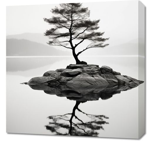 Obraz z serii pejzaże zatytułowany Samotne Drzewo to monochromatyczne zdjęcie prezentujące unikalną scenę – pojedyncze drzewo wyłaniające się z kamiennej wysepki na tle spokojnej, lustrzanej powierzchni wody. Obraz jest ujęciem w tonacji czerni i bieli, co nadaje mu ponadczasowy charakter i podkreśla minimalistyczną estetykę. Silny kontrast między ciemnymi konturami drzewa a jasnym tłem wody tworzy głębię i przykuwa uwagę. Odbicie drzewa w wodzie tworzy symetryczny i spokojny obraz, który może wnosić element spokoju i zamyślenia do każdego otoczenia. Ten obraz będzie doskonałym wyborem dla osób ceniących naturę, minimalizm oraz sztukę fotograficzną, idealny do powieszenia w salonie, biurze, czy jako element dekoracyjny w przestrzeniach wellness i spa.