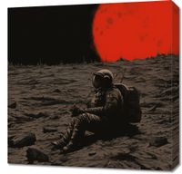 Obraz z serii abstrakcja zatytułowany Samotność w Kosmosie przedstawia astronautę siedzącego na pustkowiu księżycowym, z ogromną czerwoną gwiazdą w tle. Osamotniony kosmonauta wygląda na zamyślonego lub odpoczywającego, otoczony przez surowy, nierówny krajobraz księżycowy, z jego charakterystycznymi kraterami i szczytami. Obraz emanuje głębokim spokojem i izolacją, podkreślając zarówno piękno, jak i nieprzewidywalność przestrzeni kosmicznej. Wyrazisty kontrast między ciemnymi skałami a jaskrawą gwiazdą podkreśla dramatyczną aurę tej sceny. Ten obraz idealnie nadawałby się do dekoracji ścian w domowych biurach lub przestrzeniach edukacyjnych, inspirowanych tematyką kosmiczną.