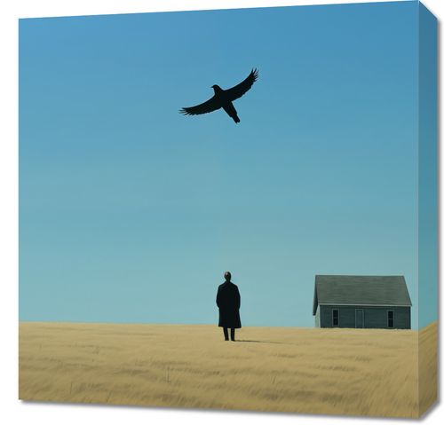Obraz z serii abstrakcja zatytułowany Samotny i Wolny. Ten spokojny obraz prezentuje postać stojącą na rozległym polu, zwróconą w stronę małego domu i latającego wysoko ptaka. Kompozycja wyróżnia się prostotą i czystością linii, a jej ograniczona paleta barw - złocistych traw, jasnoniebieskiego nieba i ciemnych sylwetek - przyciąga uwagę i wywołuje uczucie spokoju. Obraz symbolizuje kontrast między uczuciem izolacji a pragnieniem wolności, co może być interpretowane na wiele sposobów. Idealny do przestrzeni, które cenią sobie spokój i refleksję, takich jak pokoje do medytacji, minimalistyczne salony, czy współczesne gabinety.