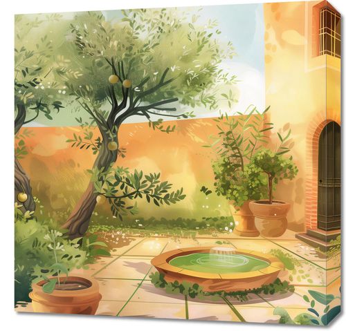 Obraz z serii abstrakcja zatytułowany Słoneczny Dzień. Obraz ukazuje idylliczny ogród w ciepły, słoneczny dzień. Widoczna jest część kamiennego patio otoczonego bujną roślinnością, z dojrzałymi cytrynami wiszącymi na gałęziach niewielkich drzew. W centrum kompozycji znajduje się dekoracyjny kamienny basen z delikatnym strumieniem wody. Na pierwszym planie widać donice z różnorodnymi roślinami, które dodają scenie domowego ciepła. Jaskrawość słońca jest złagodzona przez liście drzew, tworząc wzorzyste cienie na płytach chodnika. Architektura w tle, z żółtymi ścianami i ciemnymi drewnianymi drzwiami, współgra z naturalną paletą kolorów ogrodu. Atmosfera obrazu jest spokojna i relaksująca, sugerująca miejsce ucieczki i odpoczynku.