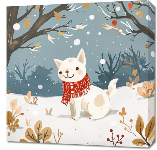 Obraz z serii wnętrza zatytułowany Śnieżny Kompan. Urocze przedstawienie białego, puchatego psa w czerwonym szaliku, który przywołuje ciepłe uczucia w chłodnym, zimowym otoczeniu. Zwierzę z radosnym wyrazem twarzy wydaje się cieszyć spadającymi płatkami śniegu, co dodaje obrazowi poczucia radości i bezpretensjonalnej zabawy. Tło w pastelowych odcieniach bieli i szarości z delikatnymi akcentami kolorystycznymi tworzy spokojną i relaksującą atmosferę. Obraz idealnie nadaje się do dekoracji pomieszczeń dziecięcych, salonów, czy przytulnych kawiarni, wprowadzając do wnętrza element zabawy i niewinności. Jego ciepłe barwy i sympatyczny motyw sprawią, że będzie doskonałym dodatkiem do miejsc, w których chcemy poczuć odrobinę zimowego ciepła i uroku.