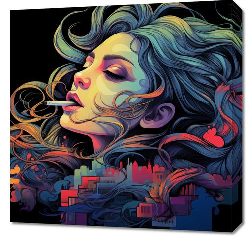 Obraz z serii pop art zatytułowany Sny o Samej Sobie. Ta intensywnie kolorowa ilustracja przedstawia profil młodej kobiety z zamkniętymi oczami, wdychającej życie miasta. Jej włosy i wydychany dym przenikają się, tworząc hipnotyzujące wzory, które płynnie przechodzą w sylwetki miejskiej panoramy. Paleta barw łączy głębokie granaty, żywe pomarańcze i delikatne pastele, co nadaje dziełu zarówno dynamikę, jak i eteryczną jakość. Obraz idealnie oddaje związek między osobistymi doświadczeniami a pulsującym życiem metropolii, co sprawia, że będzie on wyjątkowym dodatkiem do nowoczesnych, miejskich wnętrz, studiów artystycznych, czy loftów.