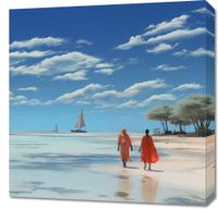 Obraz z serii pejzaże zatytułowany Spokój w Piaskach przedstawia dwie postacie w tradycyjnych pomarańczowych szatach, kroczących boso po dziewiczym piasku plaży. Ich spokojny postęp odzwierciedla harmonię i spokój, a delikatne fale i żaglowce w tle dodają uczucia swobody. Płynące chmury na niebie nadają scenie wrażenie przestrzeni i czasu, który wydaje się zatrzymany. Ten obraz emanuje duchowym spokojem i jest idealny do pomieszczeń przeznaczonych do medytacji, wypoczynku lub terapii, a także jako spokojny akcent w przestrzeniach hotelowych czy biurowych, gdzie zachęca do refleksji i wewnętrznej harmonii.