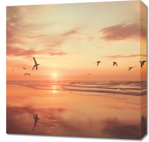 Obraz z serii pejzaże zatytułowany Spokojna Przystań przedstawia idylliczny wschód słońca nad morzem, gdzie złociste promienie światła tańczą po delikatnie falującej powierzchni wody. Sylwetki mew unoszących się na ciepłym powietrzu dodają uczucia wolności i bezkresu. Rozmyte odbicia ptaków na mokrym piasku nadmorskim wzbudzają uczucie spokoju i kontemplacji. Ten obraz jest kwintesencją ukojenia, idealny do wnętrz o tematyce nadmorskiej, czy to w prywatnych rezydencjach pragnących złapać oddech od miejskiego zgiełku, jak i w przestrzeniach wellness, spa, czy hotelowych lobby, gdzie głównym celem jest relaks i odprężenie.