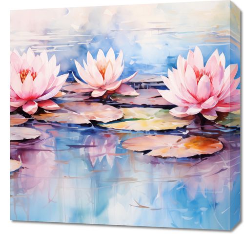 Obraz z serii natura zatytułowany Spokojne Odbicia, przedstawia trzy kwiaty lotosu unoszące się na spokojnej powierzchni wody, otoczone przez subtelnie odbijające się lilie wodne. Styl obrazu, który z jego delikatnymi, acz wyrazistymi pociągnięciami przypomina akwarelę, tworzy uczucie spokoju i medytacyjnej głębi. Pastelowa paleta barw, z dominującymi odcieniami różu i błękitu, przekazuje uczucie delikatności i spokoju. Kwiaty lotosu, symbolizujące czystość i oświecenie w wielu kulturach, są tu przedstawione w sposób, który podkreśla ich piękno i symboliczną siłę. Ten obraz idealnie odnajdzie się w przestrzeniach, które aspirują do stworzenia atmosfery spokoju i wewnętrznej harmonii, takich jak salony spa, centra medytacyjne, jadalnie, a także jako element wzbogacający wnętrza mieszkalne, zachęcając do refleksji i wyciszenia.