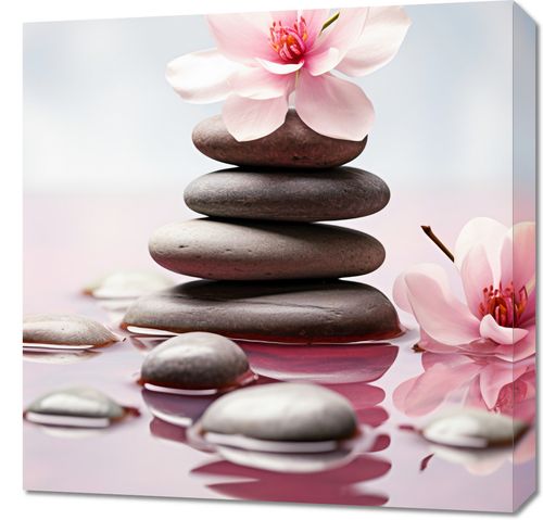 Obraz z serii natura zatytułowany Spokojne Odbicie. Delikatność różowego kwiatu doskonale kontrastuje z ciemnymi, gładkimi kamieniami, tworząc obraz pełen równowagi i spokoju. Lustro wody odbija symetrię kwiatu, podkreślając jego subtelność i kruchść, jednocześnie oddając uczucie głębi. Delikatne tło dodaje eteryczności i lekkości kompozycji. Ten relaksujący i wyciszający obraz doskonale sprawdzi się w spa, gabinetach masażu oraz w pomieszczeniach medytacyjnych, gdzie panować ma atmosfera spokoju i harmonii.