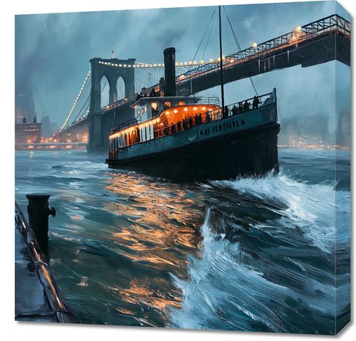 Obraz z serii abstrakcja zatytułowany Stary Parowiec uchwycił nostalgiczny obraz starego parowca przemierzającego wody przy mrocznym niebie, z tłem rozświetlonego mostu. Światła na parowcu rzucają ciepły blask na fale, tworząc złoty refleks na powierzchni wody, co kontrastuje z chłodnymi odcieniami burzowych chmur i zmierzchu. To malownicze przedstawienie, połączone z dynamiczną grą świateł i cieni, tworzy romantyczną i pełną atmosfery scenę, która przyciąga oko i wywołuje uczucie sentymentu do dawnych czasów. Idealnie nadaje się do zawieszenia w przestrzeniach, gdzie chcemy dodać element historycznej elegancji i marzycielskiego nastroju, takich jak biblioteki, studia, a nawet salony.