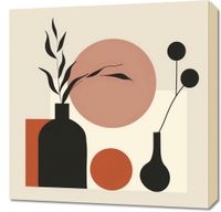 Obraz z serii boho zatytułowany Stół Roślin. Plakat przedstawia stilizowaną kompozycję abstrakcyjnych form, które mogą przypominać wazony z roślinami. Czarny, silnie zarysowany wazon po lewej stronie kontrastuje z bardziej płynnymi kształtami i ciepłymi odcieniami czerwieni i beżu, tworząc zrównoważoną, ale dynamiczną scenę. Rośliny są zredukowane do najprostszych form, co nadaje im elegancki, graficzny charakter. Prostota linii i ograniczenie detali podkreślają minimalistyczny charakter pracy. Świetnie sprawdzi się jako dekoracja w nowoczesnych, minimalistycznych przestrzeniach, gdzie może służyć jako subtelny, ale wyraźny akcent. Idealnie nadaje się do umieszczenia w salonie, sypialni lub biurze, oferując spokojny motyw przyrody w abstrakcyjnej formie, który może inspirować do refleksji i kreatywności.