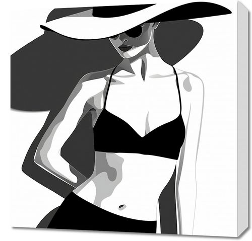 Obraz z serii abstrakcja zatytułowany Strój. Prezentuje stylizowany czarno-biały wizerunek kobiety w dwuczęściowym stroju kąpielowym. Postać odziana jest w szerokobrzmiony kapelusz, który rzuca cień na jej twarz, podkreślając elegancki i tajemniczy charakter kompozycji. Kobieta stoi w pozycji trzy czwarte, z jedną ręką opuszczoną wzdłuż ciała, a drugą lekko zgiętą w łokciu, co dodaje dynamizmu ilustracji. Obraz jest utrzymany w minimalistycznym stylu z wykorzystaniem płaskich plam kolorów i wyraźnych linii, co nadaje mu nowoczesny i modny wygląd. Ten rodzaj grafiki idealnie wpasuje się w nowoczesne wnętrza, szczególnie te o monochromatycznej kolorystyce, lub jako modny akcent w przestrzeniach o minimalistycznej estetyce.