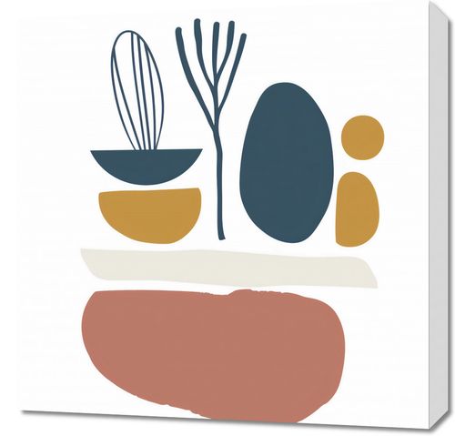 Obraz z serii boho zatytułowany Stylowa Roślinność.Na obrazie widnieje minimalistyczna kompozycja w stylu abstrakcyjnym. Grafika składa się z kilku prostych, geometrycznych kształtów w spokojnej palecie kolorów, w tym błękitu, żółci, ciemnej ochry i głębokiego czerwonego. Umieszczone są one na neutralnym, jasnym tle. Z lewej strony widzimy stylizowaną roślinność z wydłużonymi, pionowymi liniami i owalnym kształtem, który może przypominać liść lub płatek. Po prawej stronie, większe bryły koloru tworzą tło dla dwóch mniejszych kół, które mogą symbolizować słońce i księżyc lub inne elementy natury. Całość ma równowagę i wyraża spokój, będąc jednocześnie prosta, ale i intrygująca w swojej formie.