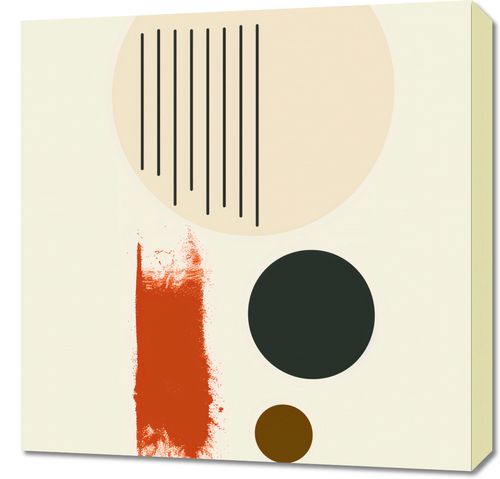 Plakat z serii boho zatytułowany Symetryczna Struna.Grafika przedstawia zrównoważoną kompozycję z surowymi elementami geometrycznymi i organicznym pociągnięciem pędzla. Kremowe tło rozświetla duże koło z rytmicznie rozmieszczonymi pionowymi liniami, które mogą symbolizować struny instrumentu lub elementy urbanistyczne. Intensywne maznięcie koloru w dolnej części obrazu dodaje energii i kontrastu, natomiast umieszczone obok czarne i brązowe kółka wprowadzają wrażenie głębi. Obraz idealnie uzupełni wnętrza w duchu minimalizmu i modernizmu, takie jak stylowe salony, gabinety, czy współczesne przestrzenie biurowe, gdzie może stanowić element kontrastujący z prostotą otoczenia.