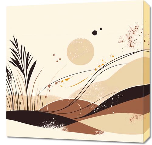 Obraz z serii minimalistycznej zatytułowany Szept Gwizdu. Widać na nim stylizowaną kompozycję z trawami i kształtami, które mogą przywoływać na myśl górskie krajobrazy. Barwy są ciepłe i naturalne, z dominującymi beżami, brązami oraz akcentami w kolorze terakoty.Ten plakat doskonale uzupełni wnętrza w stylu boho, skandynawskim, jak również te o bardziej rustykalnym czy naturalnym charakterze. Jego spokojna paleta kolorów i subtelna grafika sprawią, że będzie idealnym dodatkiem do sypialni lub salonu, wprowadzając atmosferę relaksu i spokoju.