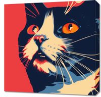 Obraz z serii abstrakcja zatytułowany Szok. Obraz przedstawia zbliżenie na twarz kota w stylizowanej, graficznej formie. Przeważającym kolorem jest intensywny czerwony, który stanowi tło dla sylwetki kota. Wyraziste, żółte oczy zwierzęcia przyciągają uwagę, a ich niemal hipnotyzujący wzrok jest skierowany ku widzowi. Wizerunek kota jest zróżnicowany kolorystycznie: od ciemnych odcieni, poprzez szarości, aż po żywe akcenty błękitu i pomarańczy, które dodają dynamiki i głębi. Detale takie jak wąsy i futro są wyraźnie zaznaczone białymi i niebieskimi liniami, co nadaje ilustracji ruch i teksturę. Całość kompozycji ma współczesny, prawie popartowy charakter, przyciągając wzrok i wzbudzając emocje. Jest to dzieło, które mogłoby znaleźć miejsce w nowoczesnych przestrzeniach, podkreślając miłość do zwierząt i sztuki.
