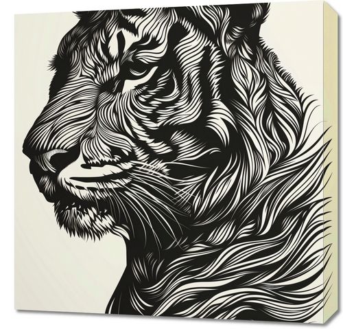 Obraz z serii wnętrza zatytułowany Tygrysi Gwizd. Ta dramatyczna grafika przedstawia tygrysa w stylu linorytu, z wyraźnymi, płynnymi liniami układającymi się w złożony wzór futra. Monochromatyczna paleta, z ciemnymi i jasnymi odcieniami na neutralnym tle, podkreśla majestatyczną postawę i intensywny wzrok tego dzikiego zwierzęcia. Obraz emanuje siłą i elegancją, oddając w pełni królewski charakter tygrysa. Idealny do wnętrz urządzonych w stylu minimalistycznym lub nowoczesnym, będzie także pasował do przestrzeni, które chcą podkreślić motywy przyrodnicze lub eksplorować tematykę ochrony dzikiej przyrody.
