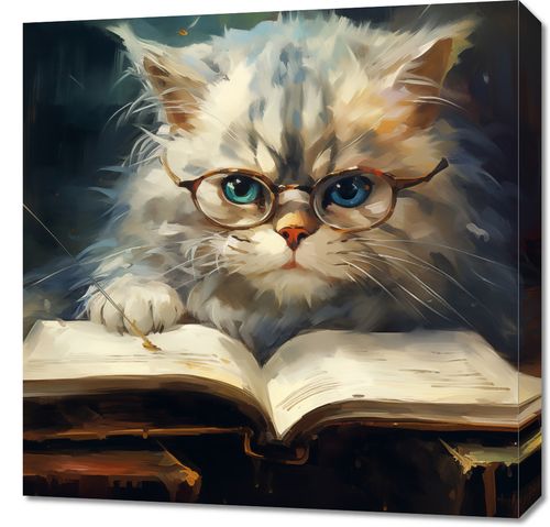 Obraz z serii abstrakcja zatytułowany Ucz Się Ucz. Plakat prezentuje uroczego, puszystego kota rasy perskiej, który z zadumą spogląda przez okulary w stylu vintage, przypominające okulary profesora. Kot wydaje się być zanurzony w lekturze otwartej książki, której strony delikatnie dotyka łapą. Całość jest utrzymana w ciepłej, złotej kolorystyce, co nadaje scenie przytulny, kameralny nastrój. Obraz ma charakter impresjonistyczny, z widocznymi pociągnięciami pędzla, które dodają dynamizmu i tekstury. Ten obraz idealnie wpasowałby się w atmosferę bibliotek, zakątków do czytania, a nawet jako dekoracja w salonach lub gabinetach, dodając wnętrzu intelektualnego charakteru i ciepła.