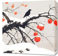 Obraz z serii motywy wschodnie zatytułowany Wschodnia Akwarela przedstawia zimowy krajobraz w stylu wschodnim. Drzewo o ciemnych, wyrazistych gałęziach pokrytych śniegiem wygina się elegancko na tle spokojnego, jednolitego tła. Na gałęziach znajdują się czerwone owoce, które mogą być symbolem persymonów lub innych zimowych owoców, kontrastujących swoim żywym kolorem z zimowym otoczeniem. Na jednej z gałęzi spoczywa czarny ptak, być może kruk, co dodaje życia i głębi kompozycji. Spadające płatki śniegu i subtelne odcienie w tle nadają scenie uczucie spokoju i ciszy. Ten obraz łączy prostotę z elegancją, mogąc stanowić wyrafinowaną dekorację w przestrzeniach szukających spokojnej, lecz wyrazistej estetyki.