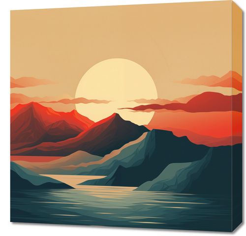 Obraz z serii pejzaże zatytułowany Zachód Słońca nad Górami. Ten graficzny obraz przedstawia stylizowany krajobraz górski o zachodzie słońca, z dominującymi ciepłymi odcieniami czerwieni i pomarańczy, które kontrastują z spokojnymi tonami ciemnego morza. Harmonia kolorów i płynne linie nadają kompozycji spokojny, ale zarazem wyrazisty charakter. Doskonale sprawdzi się jako centralny punkt w każdym pomieszczeniu, wprowadzając element ukojenia i inspirującej natury. Idealny dla tych, którzy pragną dodać do swojego wnętrza nutę artystycznego spokoju.