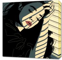 Obraz z serii abstrakcja zatytułowany Zamysł. Obraz przedstawia kobietę z zamyślonym wyrazem twarzy, z głową opartą na dłoni, co sugeruje moment introspekcji lub smutku. Silne cienie i linie świetlne tworzące prążki na jej twarzy dodają głębi kompozycji, a kontrastująca paleta kolorów z dominującymi odcieniami niebieskiego i czerni, podkreślona akcentem czerwieni ust, potęguje emocjonalne napięcie dzieła. Ten obraz może symbolizować skomplikowane emocje ludzkiego doświadczenia i jest idealnym dodatkiem do przestrzeni, które cenią sobie głębię i wyrazistość w sztuce, takich jak salon, studio twórcze, czy miejsce do medytacji.