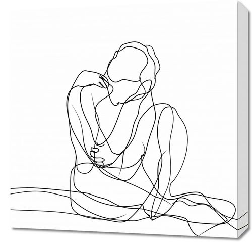 Obraz z serii wnętrza zatytułowany Zgarbienie. Obraz przedstawia minimalistyczny, jednoliniowy rysunek siedzącej postaci. Jest to przykład sztuki line art, gdzie cała forma jest zredukowana do jednej, ciągłej linii, która tworzy zarówno zewnętrzny kontur postaci, jak i wewnętrzne detale ciała i ubioru. Postać wydaje się zatopiona w myślach, z głową opartą na dłoni, co sugeruje introspekcję lub głębokie zamyślenie. Prosta elegancja tej pracy polega na jej zdolności do przekazywania emocji i postawy bez nadmiernego skomplikowania formy. Czyste tło podkreśla subtelność i skupienie kompozycji. Taki obraz może idealnie wpasować się w nowoczesne, ascetyczne wnętrza, gdzie może stanowić spokojny, ale wyrazisty akcent artystyczny.