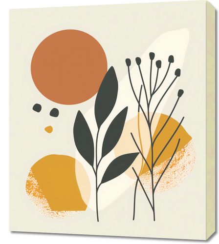 Obraz z serii boho zatytułowany Botaniczna Presja. Obraz prezentuje poetycką kompozycję botanicznych motywów i abstrakcyjnych form. Złapany w chwili spokoju bukiet delikatnych, ciemnozielonych gałązek z czarnymi owocostanami wznosi się dumnie na tle złocisto-pomarańczowych i beżowych kształtów, które mogą przypominać wschodzące słońce lub płatki kwiatów. Dyskretnie rozsiane mniejsze elementy, jak kropki w tonacji ziemi, nadają kompozycji lekkości i ruchu. Ta harmonijna gra kolorów i form wywołuje uczucie ciepła i natury, co czyni go idealnym dla przestrzeni, które mają na celu promowanie relaksu i odprężenia, jak salony, pokoje do jogi, czy też jadalnie, gdzie delikatne sztuki mogą inspirować spokojne rozmowy.