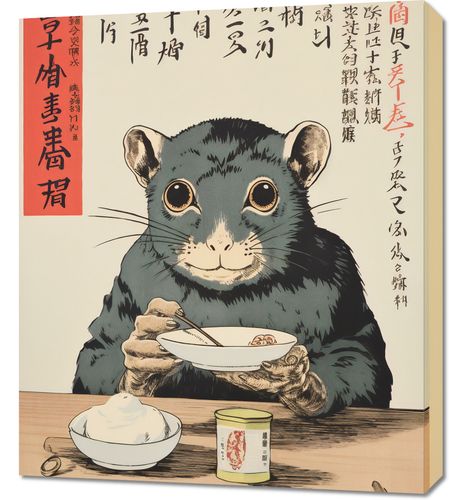 Obraz z serii motywy wschodnie zatytułowany Chwila Refleksji. Intrygujące spojrzenie gryzonia w tradycyjnym stroju, podkreślane przez błękitną tunikę i precyzyjne detale, które nadają mu humanoidalnego charakteru. Czerwone naczynia oraz kanji w tle kontrastują z jasnymi barwami obrazu, dodając nuty głębi i dziedzictwa kulturowego. Subtelna gra światła i cienia na stoliku z jedzeniem i napojem wzbogaca kompozycję i zachęca do refleksji nad połączeniem tradycji z nowoczesnością. Świetnie sprawdzi się w kawiarniach o azjatyckim klimacie, galeriach sztuki oraz w przestrzeniach dedykowanych kulturze Wschodu.