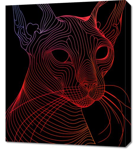Obraz z serii pop art zatytułowany Cyfrowa Kocica przedstawia futurystyczny wizerunek kota sfinksa, wykonany za pomocą płynnych, abstrakcyjnych linii w odcieniach czerwieni i pomarańczu na głębokim, czarnym tle. Wzór linii tworzy iluzję trójwymiarowości i ruchu, podkreślając wyraziste cechy kociego profilu, takie jak duże uszy, wyłaniające się oczy i charakterystyczne rysy twarzy. Minimalistyczne użycie koloru i linii w kontraście z ciemnym tłem nadaje dziełu nowoczesny wygląd, który przyciąga wzrok i pobudza wyobraźnię. Ten artystyczny obraz świetnie wpisze się w wnętrza o nowoczesnym designie, szczególnie wśród miłośników zwierząt i miłośników sztuki cyfrowej, nadając przestrzeni odrobinę współczesnego stylu i kociego wdzięku.
