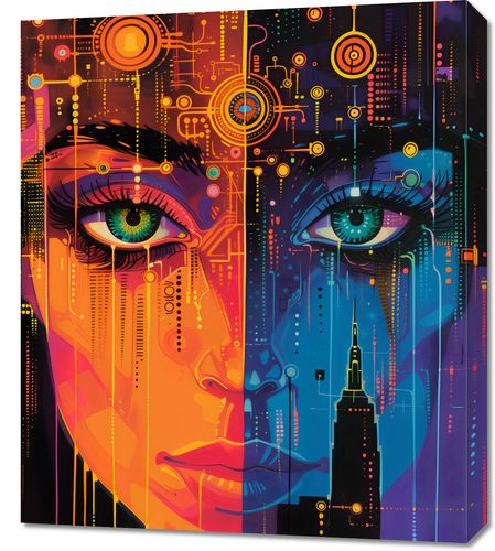 Obraz z serii abstrakcja zatytułowany Cyfrowa Psyche. Przedstawia fascynującą symetrię między ludzką urodą a technologicznym zawirowaniem. Wyraźne, zielone oczy kobiety są centralnym punktem obrazu, ożywione wizją elektronicznych obwodów i cyfrowych sygnałów, które przepływają przez i wokół jej wizerunku. Przecinające twarz linie symbolizują połączenie osobowości z nowoczesnymi technologiami, podczas gdy tło ukazuje zarys charakterystycznego krajobrazu miejskiego. Intensywne, neonowe kolory od pomarańczowego do niebieskiego nadają dziełu dynamiczny i nowoczesny charakter. Obraz ten będzie idealnym dodatkiem do współczesnych biur, salonów gier lub innych przestrzeni kreatywnych, które celebrują połączenie sztuki i technologii.