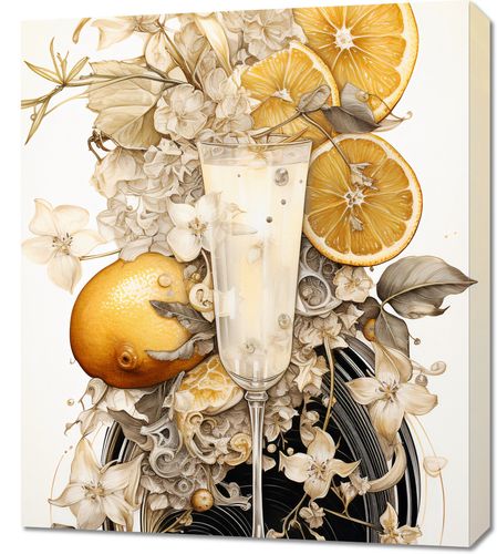 Obraz z serii wnętrza zatytułowany Esencja Cytrusów. Zmysłowy pejzaż ukazuje krystaliczną szampanową kieliszek otoczony bujnym kwiatem i soczystymi plasterkami cytryny. Delikatne białe kwiaty i misternie rysowane detale dodają kompozycji głębi i subtelności, podczas gdy wyraziste żółte akcenty cytryny dodają energii i świeżości. Całość wprowadza w stan relaksu i orzeźwienia, przypominając o chwilach spędzonych na letnich tarasach. Idealnie wpasuje się w eleganckie restauracje, bary koktajlowe lub nowoczesne kawiarnie z akcentami śródziemnomorskimi.