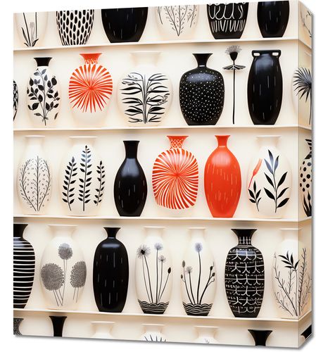 Obraz z serii wnętrza zatytułowany Gliniana Harmonia. Precyzyjnie ułożone wazony na półkach prezentują się niczym w muzeum sztuki użytkowej. Ich geometryczne i roślinne wzory, oscylujące między czernią, bielą i czerwienią, tworzą hipnotyzującą kompozycję. Prostota i elegancja tych przedmiotów, w połączeniu z ich zróżnicowaną fakturą i wzornictwem, dodają wnętrzom niepowtarzalnego charakteru. Idealnie komponują się zarówno w nowoczesnych loftach, jak i tradycyjnych pokojach kolekcjonera. Ta estetyczna kolekcja doskonale odda atmosferę w galeriach designu oraz w ekskluzywnych salonach z antykami.