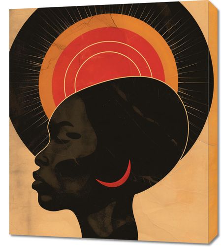 Obraz z serii abstrakcja zatytułowany Gorące Promienie to urzekający portret profilu kobiety, który wyraża siłę i spokojną godność. Jej sylwetka jest wyraźna i zdecydowana, z podkreślonymi, mocnymi liniami, a tło za jej głową tworzy aureolę w ciepłych odcieniach, od ciemnego poprzez jaskrawe odcienie pomarańczu do złota, co może symbolizować wschód lub zachód słońca. Te koncentryczne kręgi przypominają również halo, które często widnieje na obrazach świętych lub ikonach, nadając postaci niemal boski wymiar. Czarny kolor sylwetki w połączeniu z bogatymi, złotymi odcieniami tworzy mocny kontrast, który przyciąga wzrok i sugeruje tajemnicę oraz niezwykłą wewnętrzną siłę. Obraz ten jest elegancki i wyrazisty, doskonały do każdego wnętrza, w którym chce się podkreślić piękno, siłę i kulturowe bogactwo.