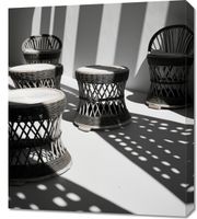 Obraz z serii wnętrza zatytułowany Gra Świateł to stylowa, monochromatyczna fotografia, która oddaje estetykę współczesnego designu. Na fotografii widzimy zestaw eleganckich, plecionych stołków z rattanu ustawionych na tle geometrycznych cieni. Ostre linie cieni przełamują okrągłe kształty mebli, tworząc fascynującą kompozycję pełną kontrastów. Białe siedziska stołków pięknie kontrastują z ciemniejszymi elementami, a gra światła i cienia nadaje scenie trójwymiarowość i teksturę. Obraz ten będzie doskonały dla miłośników minimalistycznych wnętrz, a także dla osób poszukujących elementu dekoracyjnego, który wprowadzi do pomieszczenia nowoczesny i artystyczny akcent. Idealny do nowoczesnych przestrzeni mieszkalnych, biur, kawiarni lub galerii sztuki.