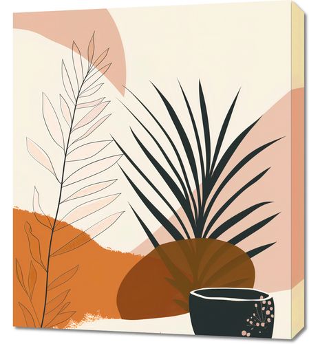 Obraz z serii minimalistyczne zatytułowany Harmonia Zen.Przedstawia eleganckie, abstrakcyjne formy roślin i geometryczne figury w ciepłych, pastelowych barwach zachodzącego słońca. Centralnym elementem jest stylowy czarny kubek z dekoracyjnym wzorem, który nadaje kompozycji głębi. Obraz ten będzie idealnym dodatkiem do spokojnych i stylowych wnętrz, jak sypialnie, pokoje relaksacyjne czy nowoczesne przestrzenie biurowe, wprowadzając atmosferę wyciszenia i estetycznego porządku.