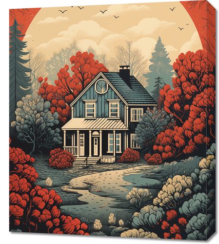 Obraz z serii wnętrza zatytułowany Idylla Rustykalna. Ten ciepły i urokliwy obraz przedstawia sielski dom otoczony przez bujny krajobraz w odcieniach czerwieni i pomarańczy, których intensywność podkreśla zachodzące słońce w tle. Kompozycja łączy w sobie elementy klasycznego amerykańskiego krajobrazu z nostalgicznym uczuciem, które przywodzi na myśl długie, leniwe popołudnia na wsi. Ilustracja ta idealnie nadaje się do nadania charakteru i ciepła każdemu wnętrzu, doskonale pasując do przestrzeni mieszkalnych, kawiarni lub pensjonatów, które chcą zaakcentować swoje powiązania z naturą i wiejskim spokojem.