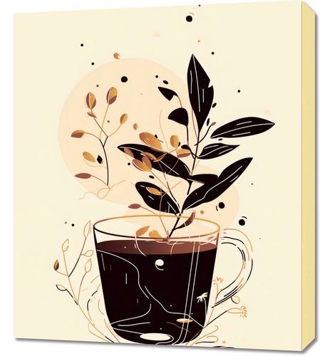 Obraz z serii minimalistyczne zatytułowany Jesienna Donica. Na obrazie widzimy czarną filiżankę pełną aromatycznej kawy, z której wyłania się roślinność w barwach jesieni. Tło w pastelowych beżach i brązach tworzy przytulną atmosferę, a drobne kropki i plamy nadają kompozycji dynamiki. Grafika oddaje ciepło i przytulność chłodniejszych dni, zapraszając do delektowania się chwilą w spokoju domowego zacisza. Idealny do wnętrz, które cenią sobie ciepłe akcenty i klimatyczne detale, pasuje do kawiarni, kuchni, lub jako element relaksującej przestrzeni w salonie.