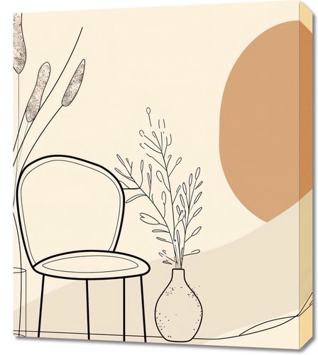 Obraz z serii boho zatytułowany Kącik Spokoju. Obraz prezentuje delikatny, linearny rysunek wnętrza, gdzie w centrum znajduje się eleganckie krzesło umieszczone obok stolika z wazonem i wysokimi, smukłymi roślinami. W tle, duża, okrągła forma w ciepłym, terra-cotta kolorze nadaje całości miękkiego, przytulnego charakteru. Linearna, subtelna paleta barw oraz gra cieni i światła tworzy atmosferę relaksu i wyciszenia. Ten obraz będzie doskonałym wyborem do dekoracji wnętrza, które ma być przestrzenią do odpoczynku i regeneracji. Jego prostota i elegancja sprawią, że doskonale odnajdzie się w salonach, pokojach do czytania, gabinetach czy medytacyjnych kącikach, wprowadzając spokojny i zbalansowany nastrój.