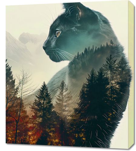Obraz z serii natura zatytułowany Koci Duch Lasu. Ten obraz prezentuje zaskakującą kompozycję, w której sylwetka czarnego kota płynnie przechodzi w mglisty krajobraz leśny, łącząc świat zwierzęcia z dziką przyrodą. Złote i ciepłe odcienie jesiennego lasu w tle kontrastują z chłodnymi tonami gór, dodając głębi i tajemniczości. Mistyczne połączenie kota z naturą symbolizuje jedność i harmonię między żywymi istotami a otoczeniem, a także podkreśla dziką i niezależną naturę kota. Obraz idealnie nadaje się do przestrzeni mieszkalnych ceniących połączenie sztuki z naturą, takich jak nowoczesne salony, pokoje relaksacyjne lub gabinety, jak również może być inspirującym elementem dekoracyjnym dla gabinetów weterynaryjnych lub przychodni zoologicznych.